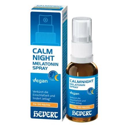 Die Folgen sind häufig Ein- und Durchschlafprobleme. Das in CalmNight Hevert Melatonin Spray enthaltene Melatonin unterstützt den natürlichen Schlaf-Wach-Rhythmus und sorgt dafür, dass man müde wird und schneller einschlafen kann. Zusatztipp: CalmNight (CTA kaufen einbauen)